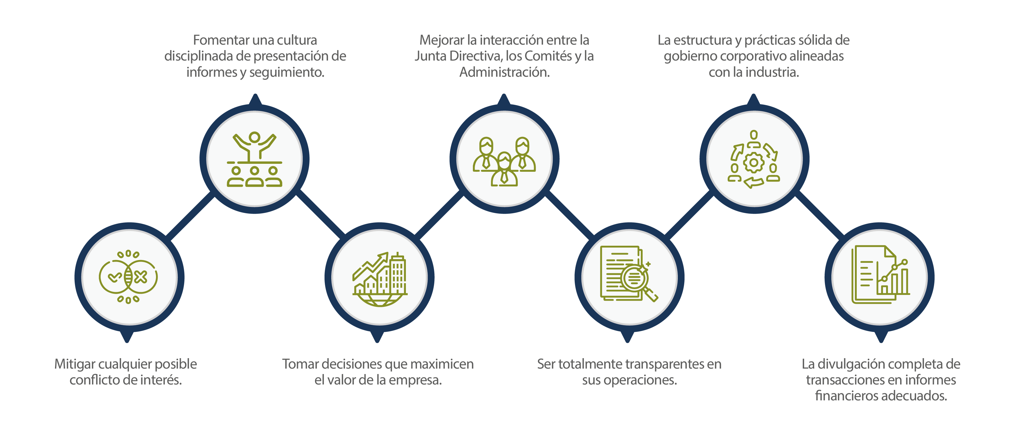 A lo largo de nuestra trayectoria, nos hemos distinguido por ser líderes en la adopción y ejecución de las mejores prácticas de Gobierno corporativo teniendo como prioridad garantizar los intereses de todos nuestros grupos de interés; con la finalidad de generar valor de forma sostenible a través de la empresa, priorizando la transparencia, la responsabilidad, el desempeño y la divulgación de la información.